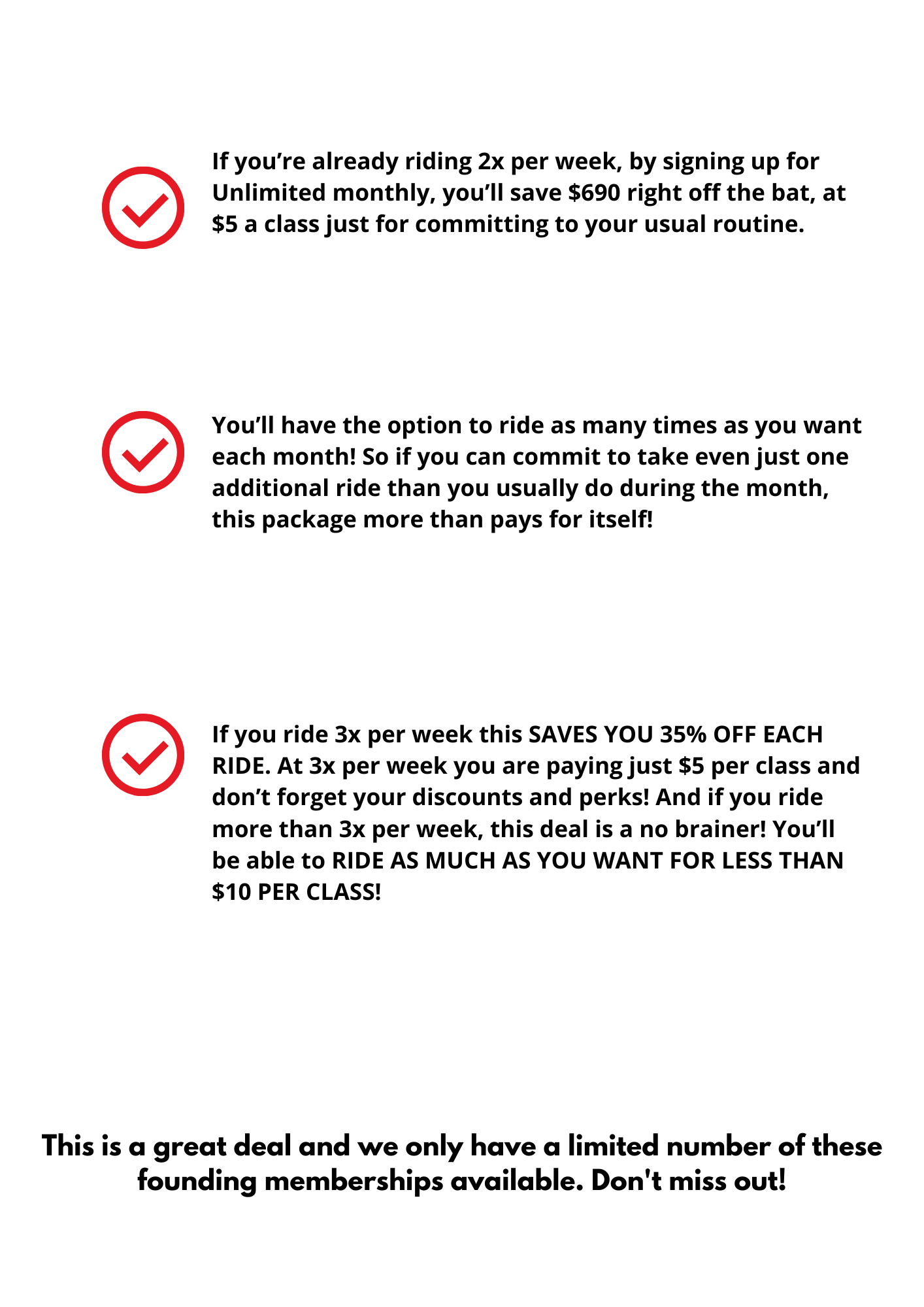 Do you already ride 2-3 times per week? Do you wish you could ride more and reap the mental and physical benefits of consistently riding more often, but feel like our ala-carte $28 per ride, 4 or 5 times a week is just too expensive? Then the Unlimited Monthly Rides Recurring Membership is perfect for you! When you become a member, you’ll ENJOY UNLIMITED RIDES EVERY MONTH + YOU GET DISCOUNTED PERKS! THE MORE YOU RIDE, THE MORE YOU SAVE!